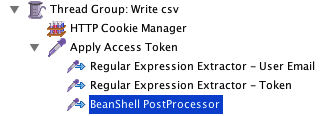 // get variables from regular expression extractor email = vars.get("uemail_RegEx"); token = vars.get("token_RegEx"); // pass true if want to append to existing file // if want to overwrite, then don't pass the second argument FileWriter fstream = new FileWriter("/app/jmeter/test_data/argList.csv", true); BufferedWriter out = new BufferedWriter(fstream); out.write(email + "," + token); out.write(System.getProperty("line.separator")); out.close(); fstream.close();